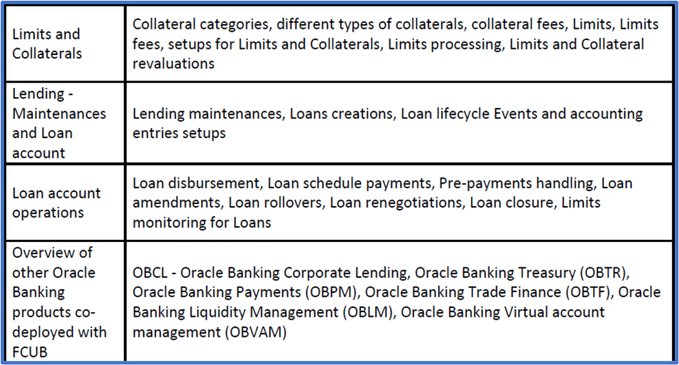 - Bridge the Skill/Knowledge gap of consultants already working or previously worked on Oracle FLEXCUBE / other Banking Products/Solutions